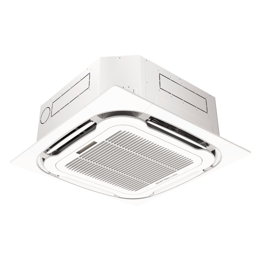 Инверторные кассетные внутренние блоки предназначены для монтажа в помещениях с подвесными потолками. Благодаря возможности раздачи воздуха в 8 направлениях и наличию управляемых жалюзи достигается эффект мягкого воздушного потока, который равномерно охватывает все помещение. Возможность работы в режиме охлаждения при наружной температуре от –30°C до +49 °C (без дополнительной адаптации) открывает широкие возможности применения инверторных кассетных сплит-систем QUATTROCLIMA. Встроенная помпа отводит скапливающийся конденсат, что облегчает выбор места для монтажа внутреннего блока. В комплекте — инфракрасный пульт дистанционного управления.