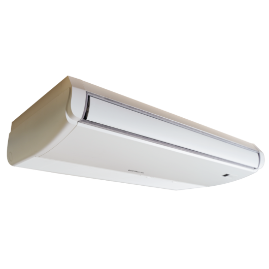 Инверторные напольно-потолочные блоки применяются в больших помещениях сложной конфигурации, а также в помещениях с низкими потолками. Внутренний блок можно смонтировать на полу у стены, либо под потолком. Первый способ позволяет направить воздушный поток вверх, благодаря чему он не попадает на людей. При втором способе монтажа поток обработанного воздуха направляется вдоль потолка и, опускаясь, он равномерно распределяется по всей площади помещения.