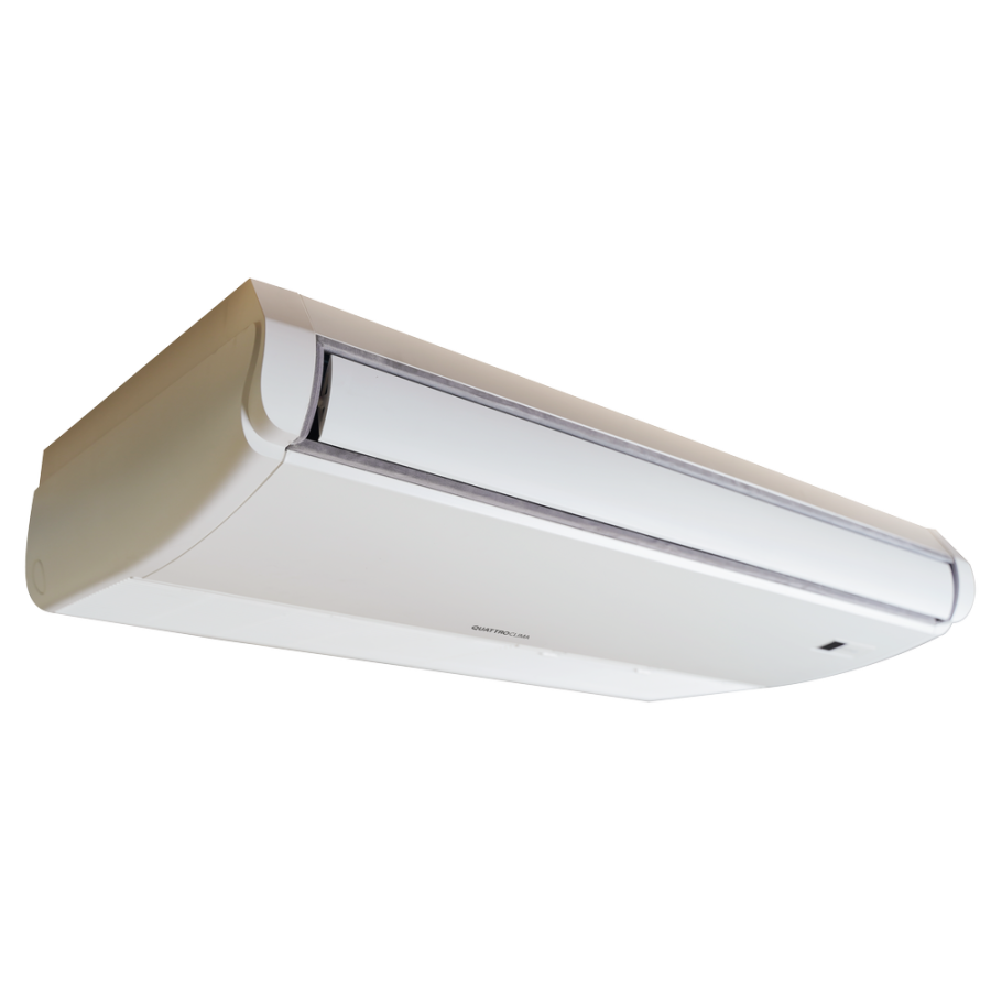 Возможность работы в режиме охлаждения при наружной температуре от –30 до +49 °C (без дополнительной адаптации) открывает широкие возможности применения инверторных напольно-потолочных сплит-систем QUATTROCLIMA. В комплекте — инфракрасный пульт дистанционного управления.