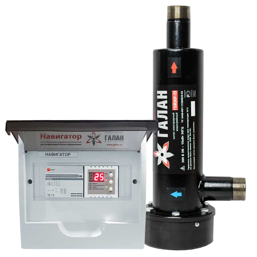 В данных комплектах электрический котёл ТЭНового типа оснащён электронным регулятором температуры Навигатор Базовый и электронным термостатом "по воздуху" Frontier TH-1149SA (точность показания 0,1 °С).